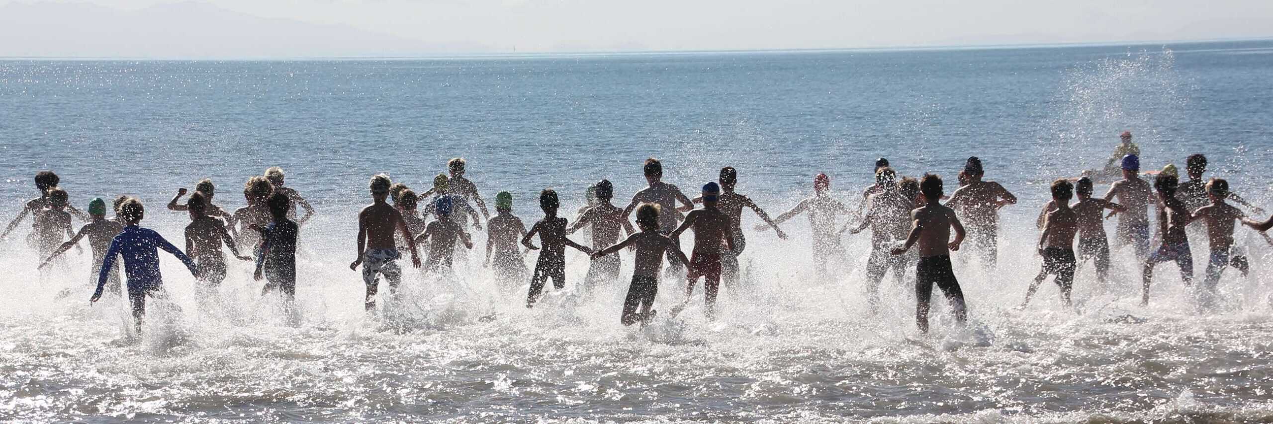 - THE SWIM IS IN DEEP WATER AND PATROLLED BY LIFEGUARDS. SWIMMERS MUST BE COMPETENT OVER 200 METRES swimming in SEA water. Do not enter children who have not swum that distance at the beach. There is a vast difference between swimming in the pool and sea. ( In the event of rough seas the swim will be canceled from the event, the event will turn into a run, bike, run event)